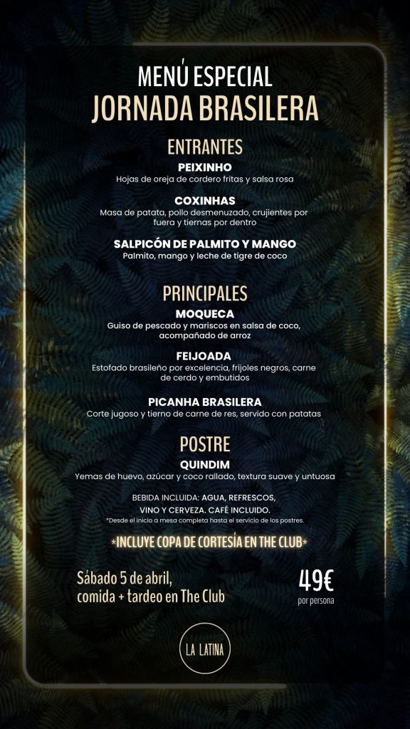 Este sábado 5 de abril al mediodía, experimentarás un viaje gastronómico al corazón de Brasil: sabores vibrantes de nuestra cocina fusión latinoamericana en un ambiente exclusivo. Descubre nuestro menú especial y haz de esta ocasión un recuerdo inolvidable.